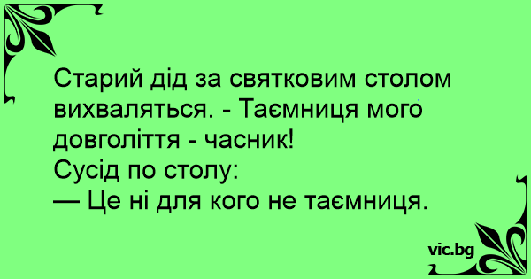 Старий дід за святковим столом вихваляться. - Таємниця мого довголіття - часник!