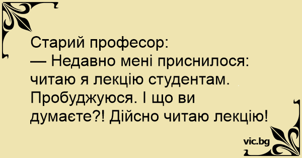 — Недавно мені приснилося: читаю я лекцію студентам. Пробуджуюся. І що ви думаєте?! Дійсно читаю лекцію!