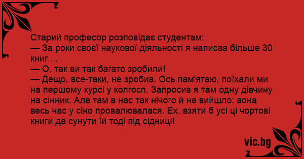 — Дещо, все-таки, не зробив. Ось пам'ятаю, поїхали ми на першому курсі у колгосп. Запросив я там одну дівчину на сінник. Але там в нас так нічого й не вийшло: вона весь час у сіно провалювалася. Ех, взяти б усі ці чортові книги да сунути їй тоді під сідниці!