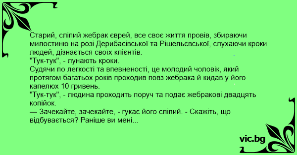 — Зачекайте, зачекайте, - гукає його сліпий. - Скажіть, що відбувається? Раніше ви мені подавали 10 гривень.