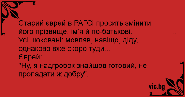 Старий єврей в РАГСі просить змінити його прізвище, ім’я й по-батькові.