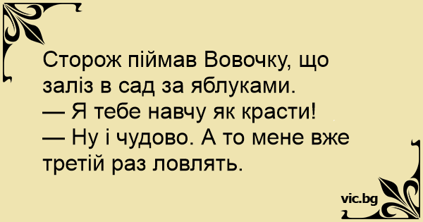 Сторож піймав Вовочку, що заліз в сад за яблуками.<br />— Я тебе навчу як красти!<br />— Ну і чудово. А то мене вже третій раз ловлять.