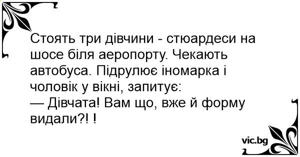 Стоять три дівчини - стюардеси на шосе біля аеропорту. Чекають автобуса. Підрулює іномарка і чоловік у вікні, запитує: