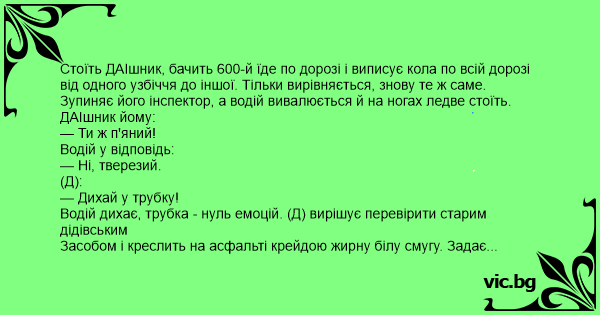 Стоїть ДАІшник, бачить 600-й їде по дорозі і виписує кола по всій дорозі від одного узбіччя до іншої. Тільки вирівняється, знову те ж саме.