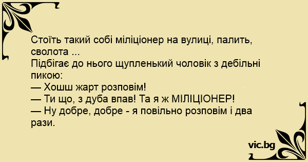 Стоїть такий собі міліціонер на вулиці, палить, сволота ...<br />Підбігає до нього щупленький чоловік з дебільні пикою:<br />— Хошш жарт розповім!<br />— Ти що, з дуба впав! Та я ж МІЛІЦІОНЕР!<br />— Ну добре, добре - я повільно розповім і два рази.