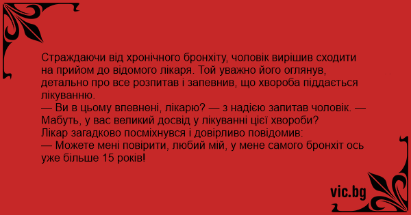Страждаючи від хронічного бронхіту, чоловік вирішив сходити на прийом до відомого лікаря. Той уважно його оглянув, детально про все розпитав і запевнив, що хвороба піддається лікуванню.