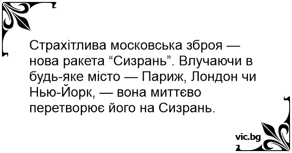 Страхітлива московська зброя — нова ракета “Сизрань”. Влучаючи в будь-яке місто — Париж, Лондон чи Нью-Йорк, — вона миттєво перетворює його на Сизрань.