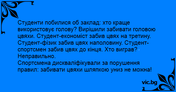 Студенти побилися об заклад: хто краще використовує голову? Вирішили забивати головою цвяхи. Студент-економіст забив цвях на третину. Студент-фізик забив цвях наполовину. Студент-спортсмен забив цвях до кінця. Хто виграв? Неправильно.