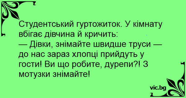 — Дівки, знімайте швидше труси — до нас зараз хлопці прийдуть у гости! Ви що робите, дурепи?! З мотузки знімайте!