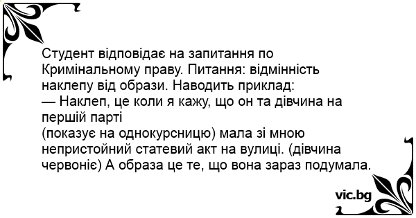 Студент відповідає на запитання по Кримінальному праву. Питання: відмінність наклепу від образи. Наводить приклад: