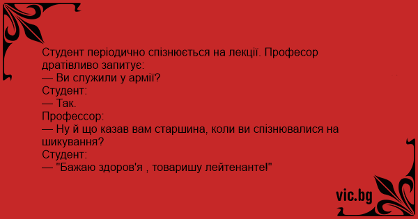 — Ну й що казав вам старшина, коли ви спізнювалися на шикування?