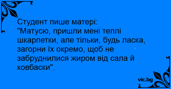 "Матусю, пришли мені теплі шкарпетки, але тільки, будь ласка, загорни їх окремо, щоб не забруднилися жиром від сала й ковбаски".