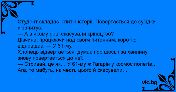 — Стривай, це як… У 61-му ж Гагарін у космос полетів… Ага, то мабуть, на честь цього й скасували…