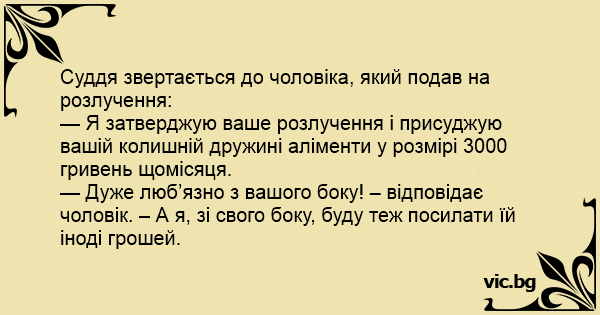 — Я затверджую ваше розлучення і присуджую вашій колишній дружині аліменти у розмірі 3000 гривень щомісяця.