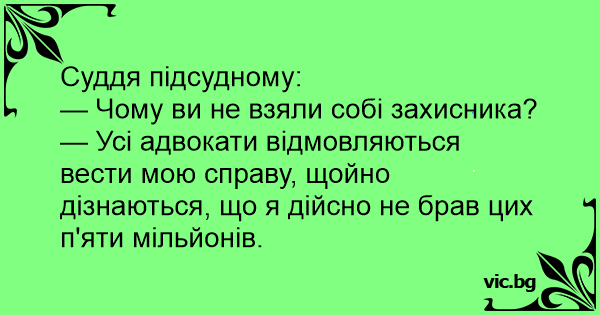 Soudce se ptá obžalovaného: "Jak to, že nemáte obhájce?" "Víte pane soudce, to je tak. Když jsem se mu přiznal, že jsem těch 500 000 doopravdy neukradl, odmítl mě obhajovat!"