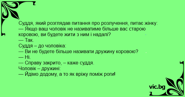 — Якщо ваш чоловік не називатиме більше вас старою коровою, ви будете жити з ним і надалі?