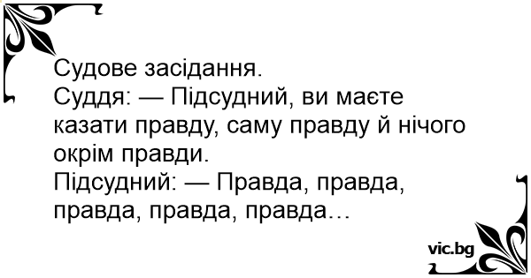 Суддя: — Підсудний, ви маєте казати правду, саму правду й нічого окрім правди.