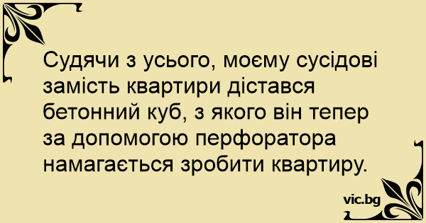 Судячи з усього, моєму сусідові замість квартири дістався бетонний куб, з якого він тепер за допомогою перфоратора намагається зробити квартиру.