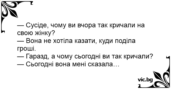 — Сусіде, чому ви вчора так кричали на свою жінку?