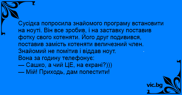 Сусідка попросила знайомого програму встановити на ноуті. Він все зробив, і на заставку поставив фотку свого котеняти. Його друг подивився, поставив замість котеняти величезний члeн. Знайомий не помітив і віддав ноут.