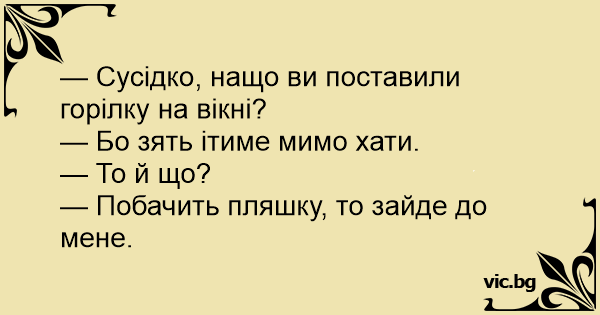 — Сусідко, нащо ви поставили горілку на вікні?