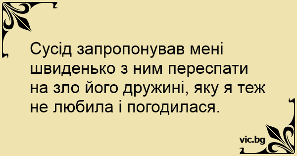 Сусід запропонував мені швиденько з ним переспати на зло його дружині, яку я теж не любила і погодилася.