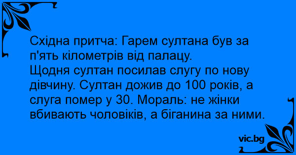 Щодня султан посилав слугу по нову дівчину. Султан дожив до 100 років, а слуга помер у 30. Мораль: не жінки вбивають чоловіків, а біганина за ними.