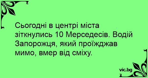 Сьогодні в центрі міста зіткнулись 10 Мерседесів. Водій Запорожця, який проїжджав мимо, вмер від сміху.