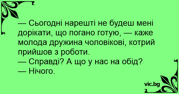 — Сьогодні нарешті не будеш мені дорікати, що погано готую, — каже молода дружина чоловікові, котрий прийшов з роботи.