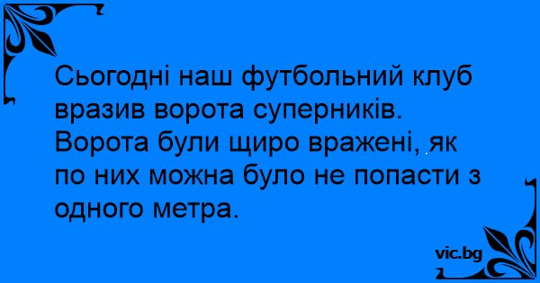 Сьогодні наш футбольний клуб вразив ворота суперників. Ворота були щиро вражені, як по них можна було не попасти з одного метра.