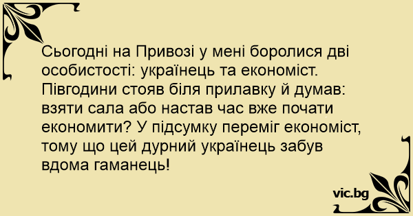 Сьогодні на Привозі у мені боролися дві особистості: українець та економіст. Півгодини стояв біля прилавку й думав: взяти сала або настав час вже почати економити? У підсумку переміг економіст, тому що цей дурний українець забув вдома гаманець!