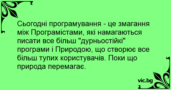Сьогодні програмування - це змагання між Програмістами, які намагаються писати все більш "дурньостійкі" програми і Природою, що створює все більш тупих користувачів. Поки що природа перемагає.