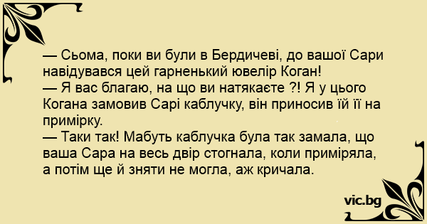 — Сьома, поки ви були в Бердичеві, до вашої Сари навідувався цей гарненький ювелір Коган!