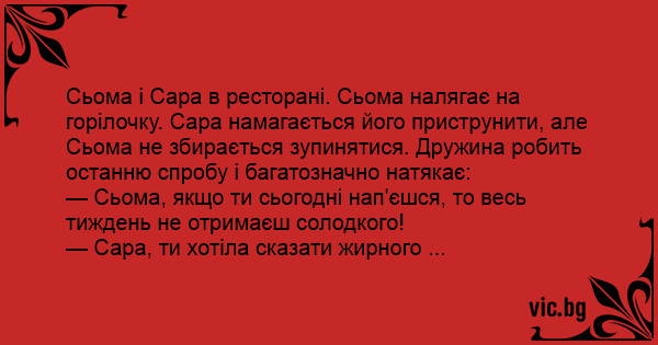 — Сьома, якщо ти сьогодні нап'єшся, то весь тиждень не отримаєш солодкого!