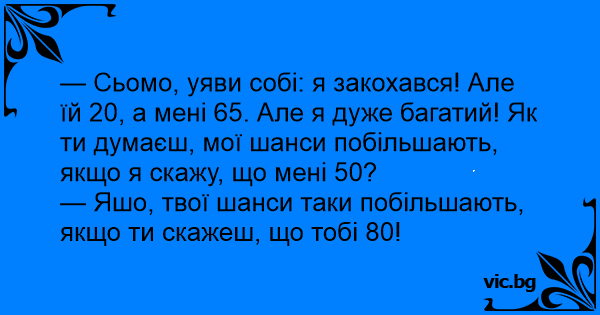 — Сьомо, уяви собі: я закохався! Але їй 20, а мені 65. Але я дуже багатий! Як ти думаєш, мої шанси побільшають, якщо я скажу, що мені 50?