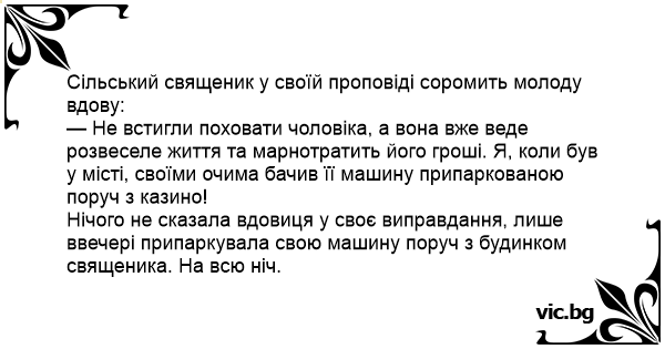Нічого не сказала вдовиця у своє виправдання, лише ввечері припаркувала свою машину поруч з будинком священика. На всю ніч.