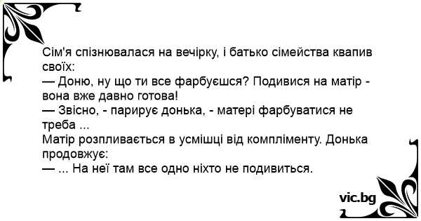 — Доню, ну що ти все фарбуєшся? Подивися на матір - вона вже давно готова!