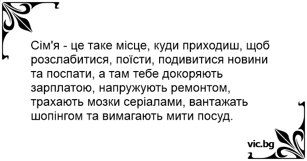Сім'я - це таке місце, куди приходиш, щоб розслабитися, поїсти, подивитися новини та поспати, а там тебе докоряють зарплатою, напружують ремонтом, трахають мозки серіалами, вантажать шопінгом та вимагають мити посуд.