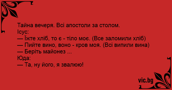 — Пийте вино, воно - кров моя. (Всі випили вина)