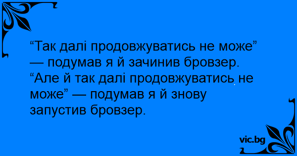 “Так далі продовжуватись не може” — подумав я й зачинив бровзер. “Але й так далі продовжуватись не може” — подумав я й знову запустив бровзер.