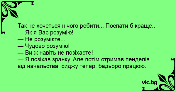 Так не хочеться нічого робити... Поспати б краще... — Як я Вас розумію! — Не розумієте... — Чудово розумію! — Ви ж навіть не позіхаєте! — Я позіхав зранку. Але потім отримав пенделів від начальства, сиджу тепер, бадьоро працюю.