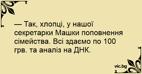 — Так, хлопці, у нашої секретарки Машки поповнення сімейства. Всі здаємо по 100 грв. та аналіз на ДНК.