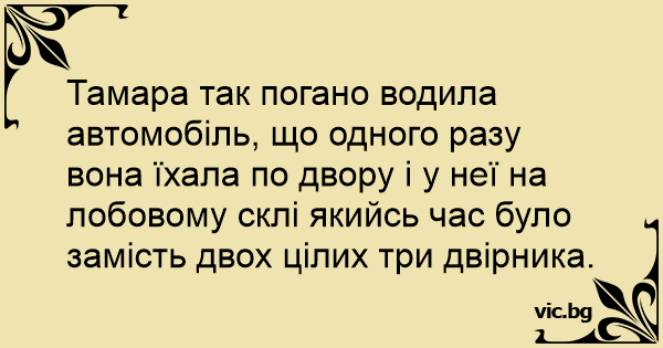 Тамара так погано водила автомобіль, що одного разу вона їхала по двору і у неї на лобовому склі якийсь час було замість двох цілих три двірника.