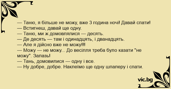 — Таню, я більше не можу, вже 3 година ночі! Давай спати!