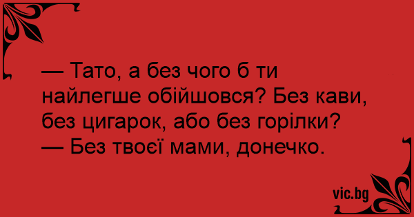 — Тато, а без чого б ти найлегше обійшовся? Без кави, без цигарок, або без горілки?