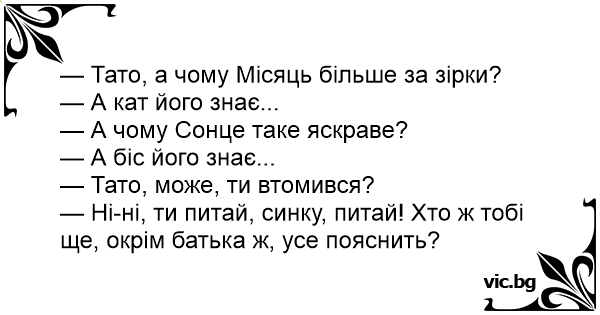 — Ні-ні, ти питай, синку, питай! Хто ж тобі ще, окрім батька ж, усе пояснить?