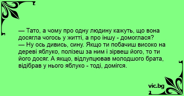 — Ну ось дивись, сину. Якщо ти побачиш високо на дереві яблуко, полізеш за ним і зірвеш його, то ти його досяг. А якщо, відлупцював молодшого брата, відібрав у нього яблуко - тоді, домігся.