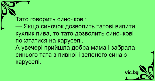 — Якщо синочок дозволить татові випити кухлик пива, то тато дозволить синочкові покататися на каруселі.