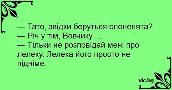 — Тато, звідки беруться слоненята? — Річ у тім, Вовчику ... — Тільки не розповідай мені про лелеку. Лелека його просто не підніме.