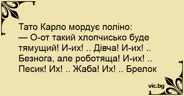 — О-от такий хлопчисько буде тямущий! И-их! .. Дівча! И-их! .. Безнога, але роботяща! И-их! .. Песик! Их! .. Жаба! Их! .. Брелок